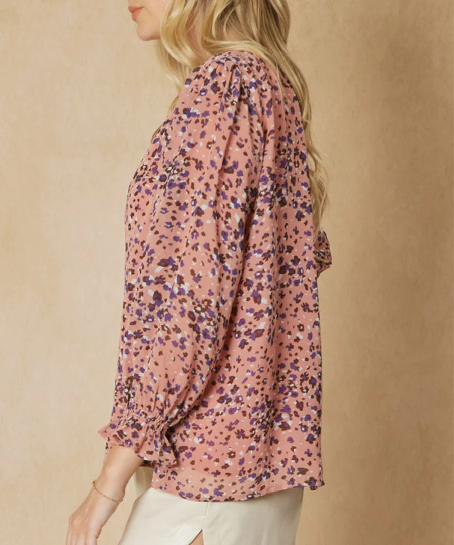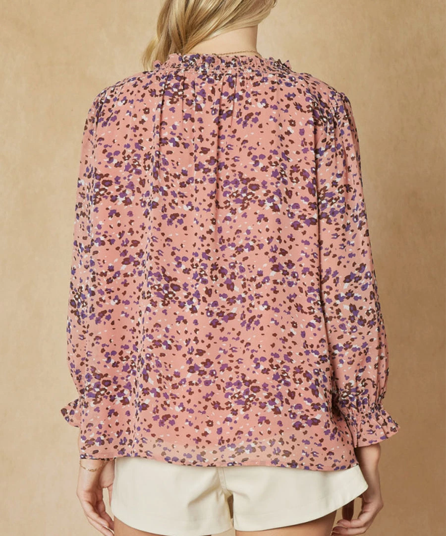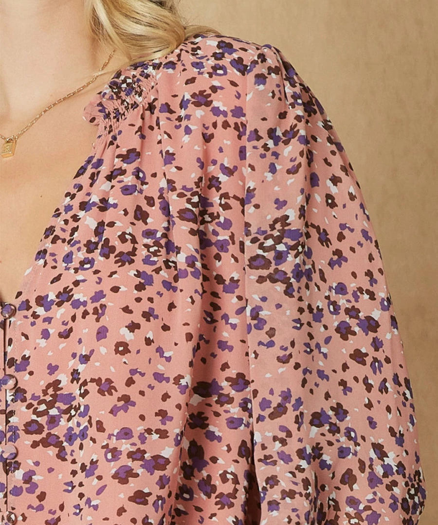 This top features an all over abstract floral print, v-neckline, and long sleeves. It has a smocked collar and cuffs. Throw this top on with your favorite jeans and heels for an easy and chic outfit!