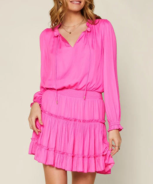 This ultra flattering silhouette is a best selling shape for a reason! Featuring a cinched waist, ruffle detail and self tie neck, this dress can easily be dressed up or down.