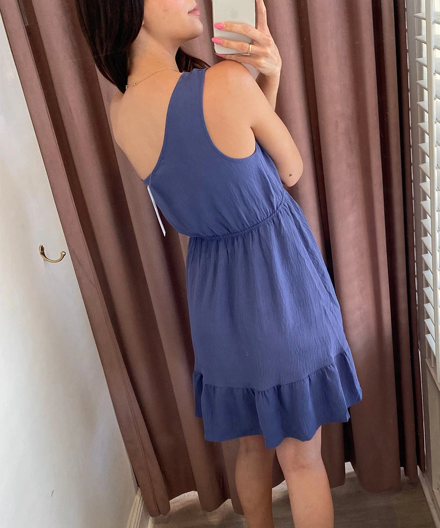 This darling one shoulder dress features a textured body and a cinched waist. Comfy and so cute, this can be dressed up or down and worn all summer.