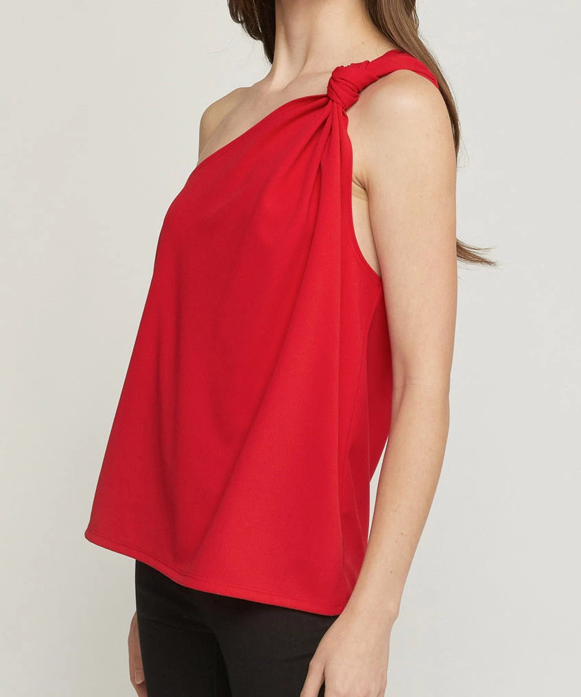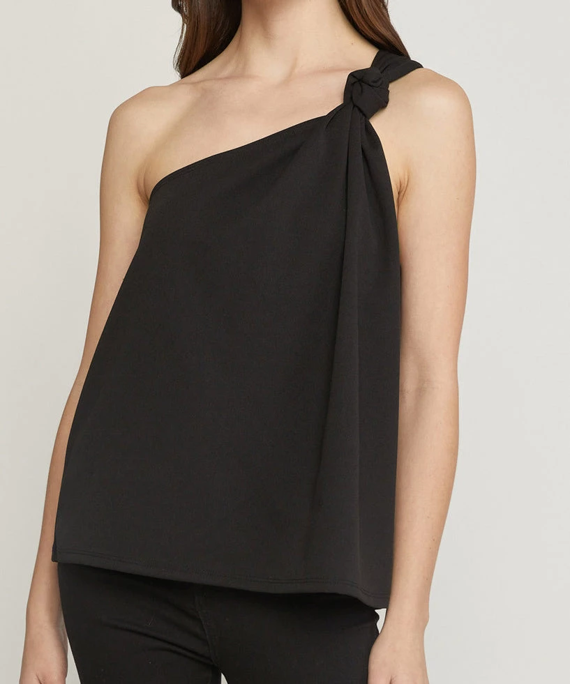 This pretty one shoulder top features a fun knot detailing at the front. An easy top to dress up or down. Throw it on with jeans for a night out and instant glam.