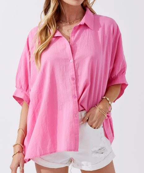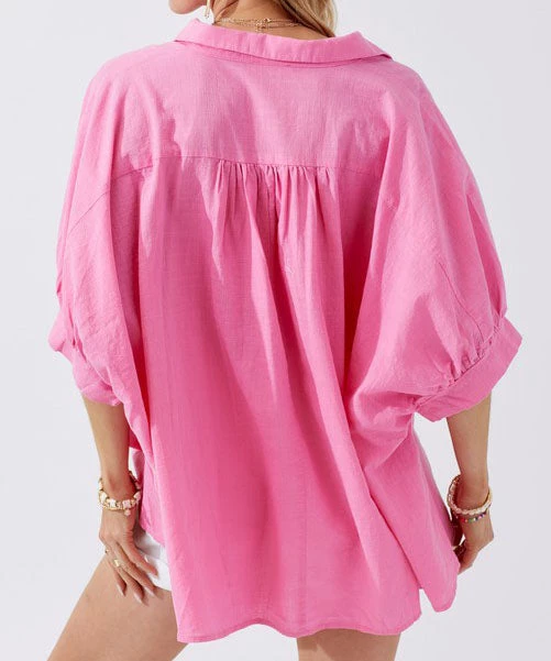 This oversized button down shirt is the perfect to throw on for casual days. Done in the a fun pop of color, this top is comfy and chic.