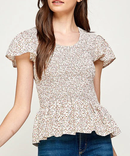 This pretty floral peplum top features short sleeves and a smocked bodice. A must to dress up or down. This top is flattering and feminine.