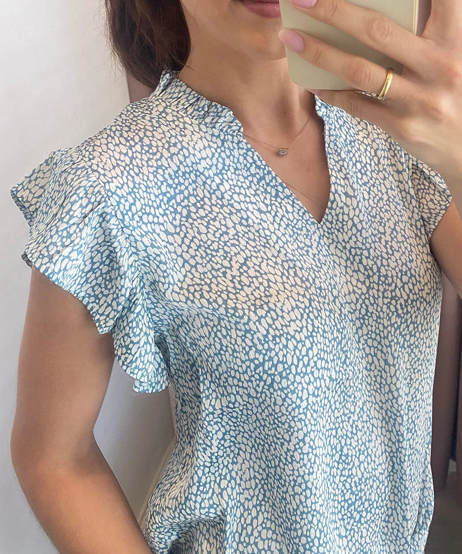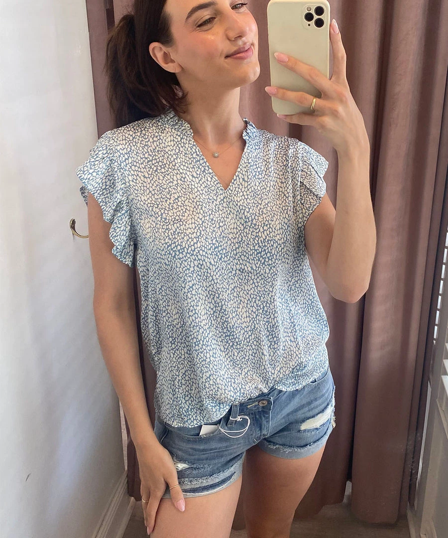 This darling blouse features a fun spotted print, v-neckline and short flutter sleeves. Easy to style and comfy to wear, this top can be worn for work or play.