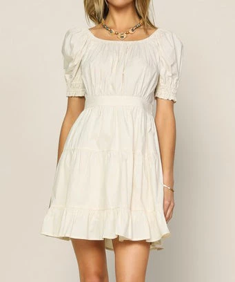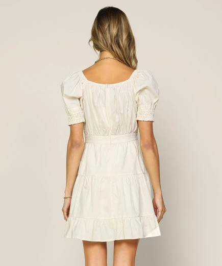 This pretty dress features short puff sleeves and a tiered body. Easy to dress up or down, this dress is cotton, comfy and chic!