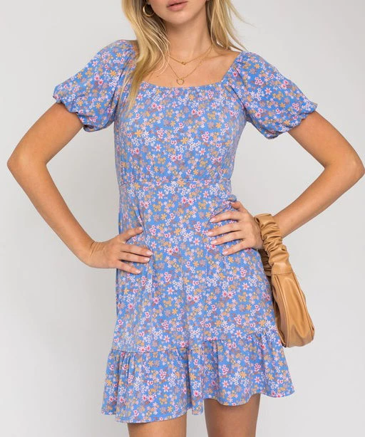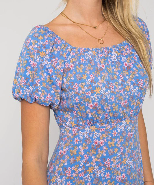 This floral print dress features puff sleeves and a square neckline. An easy silhouette that is feminine and pretty.