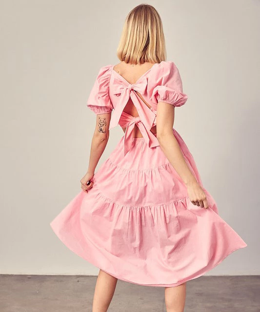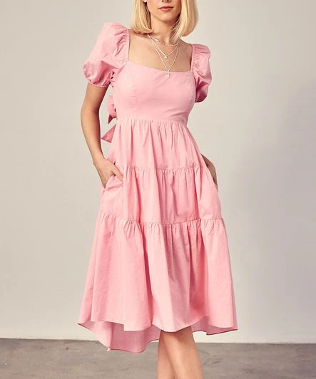 Pretty in pink! This gorgeous dress features puff sleeves and a back bow tie. This easy midi length can be worn dressed up or down.
