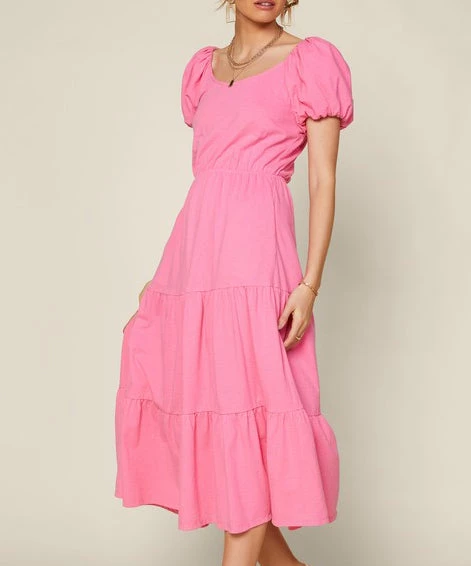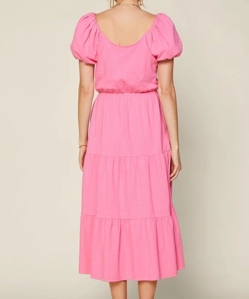 The perfect summer dress featuring short puff sleeves and a tiered body with pockets. Comfy, chic and easy to style and wear. A warm weather must!