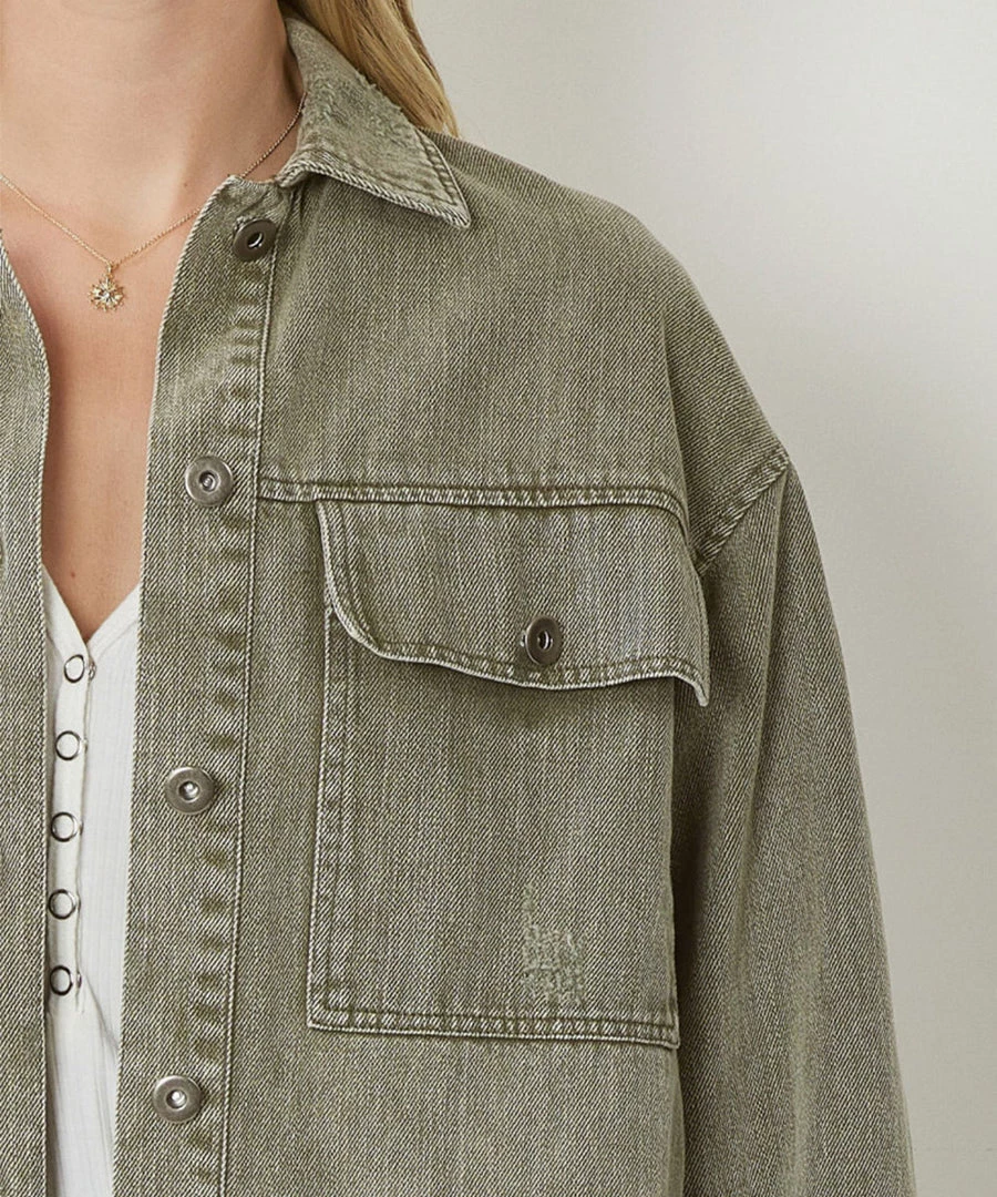 This adorable denim jacket is a must have! It features pockets at the bust, button closures on the wrist, and a frayed hem.