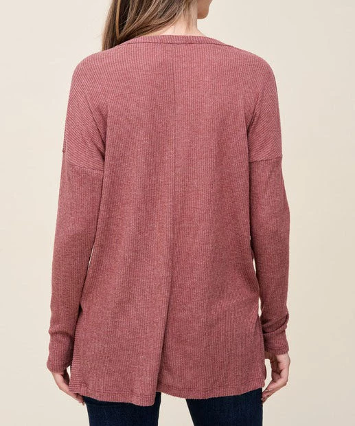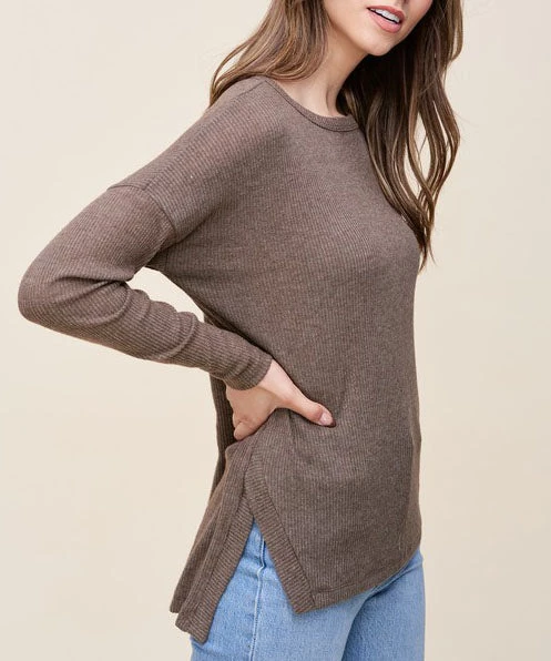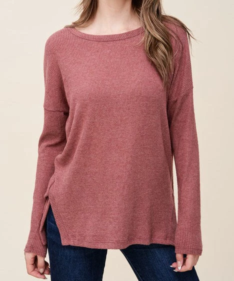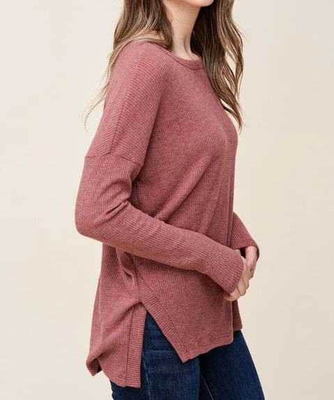 This brushed knit top features a ribbed texture, long sleeves, a round neckline and side slits. A go to casual top that looks so cute with everything from jeans to leggings.