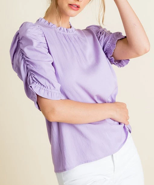 This darling top features ruched sleeve detail and the prettiest shade of lilac. A summer must to wear with everything from jeans to shorts to skirts.