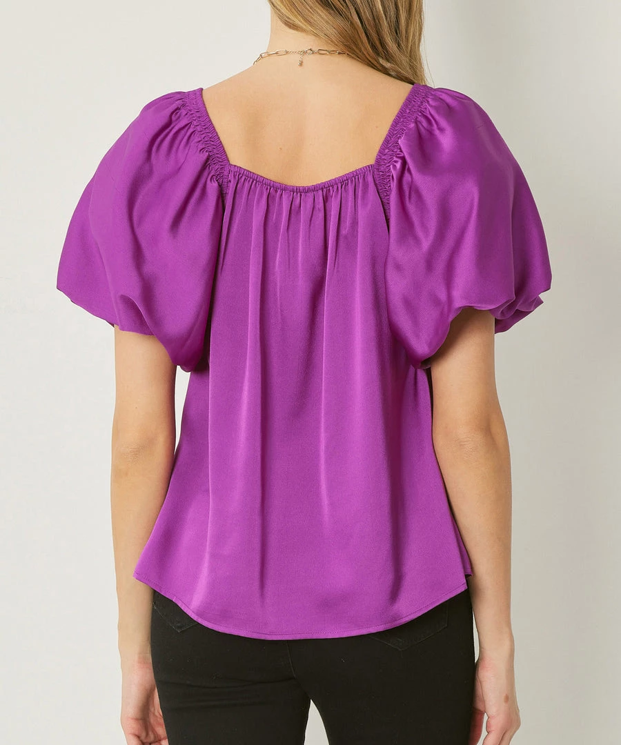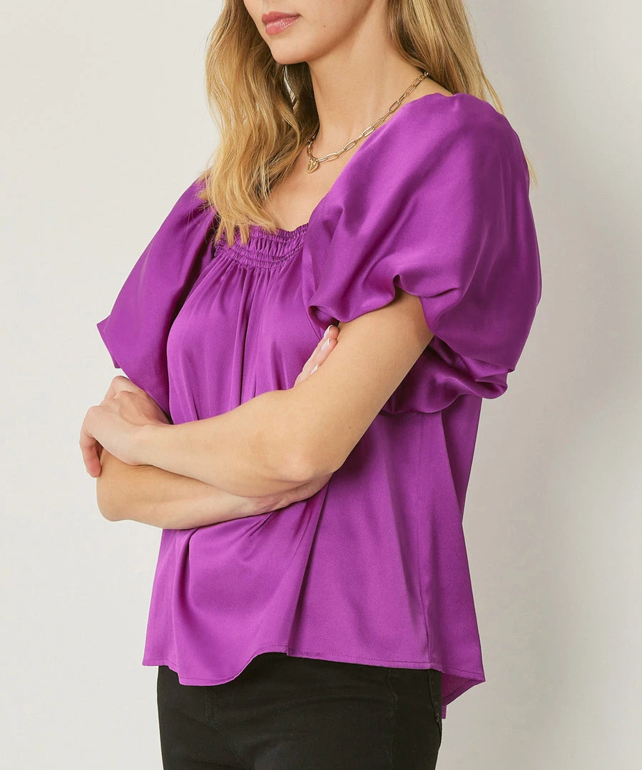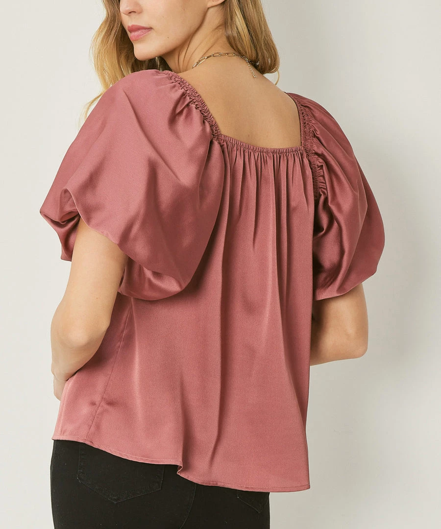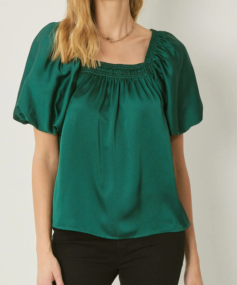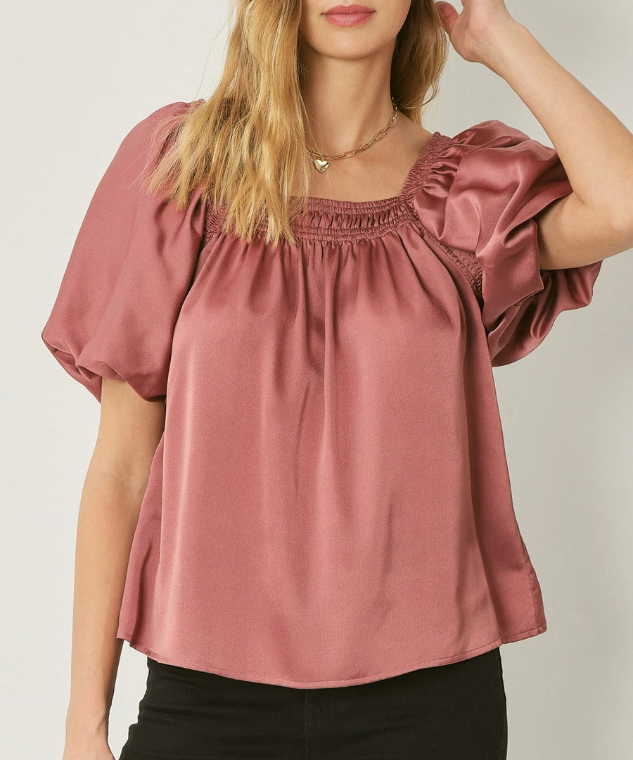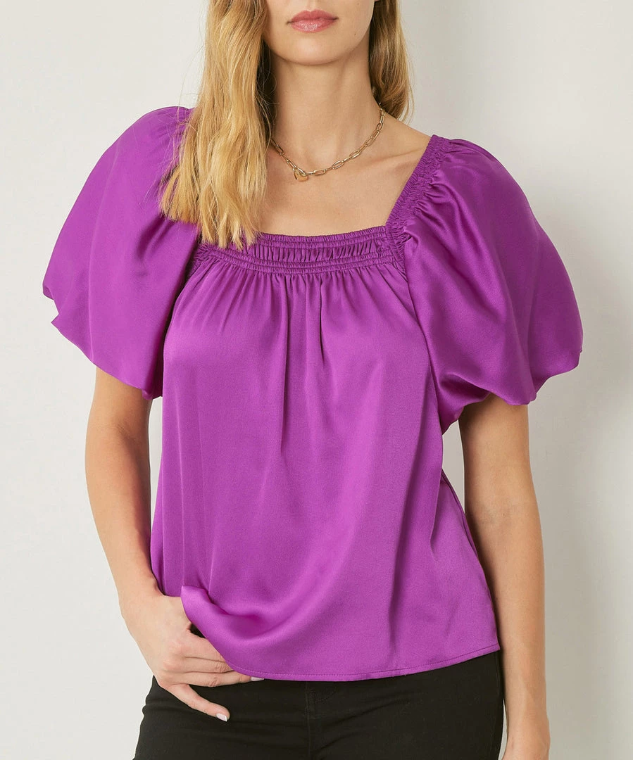 This gorgeous stain top features a square neckline with smocking detail and bubble sleeves. So glam and chic, this top can easily be dressed up or down.