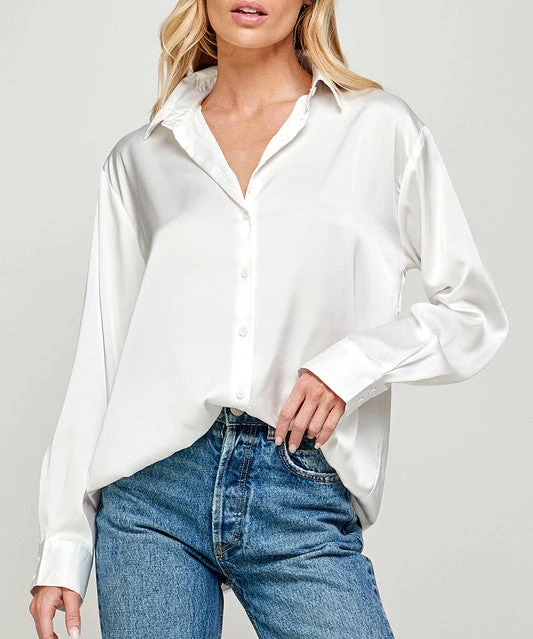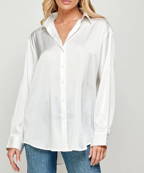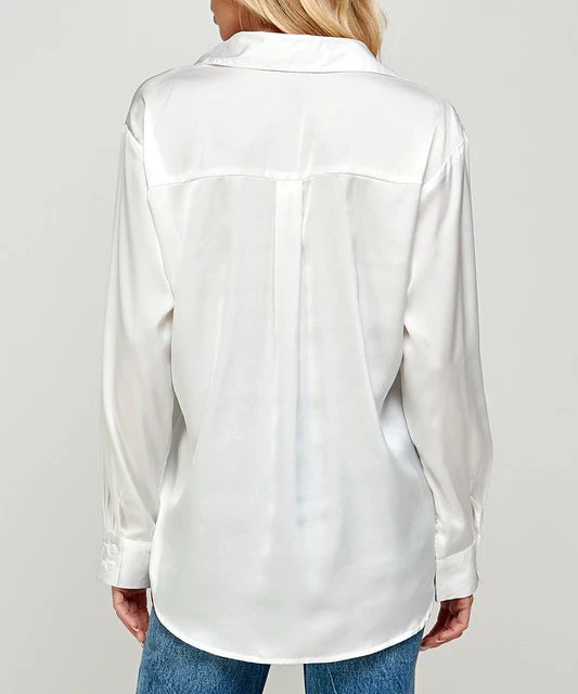 This classic white button-down blouse is updated in a satin like fabric. A must to wear for work during the week and to throw on with jeans for a polished weekend look. Classic, timeless and effortlessly chic.