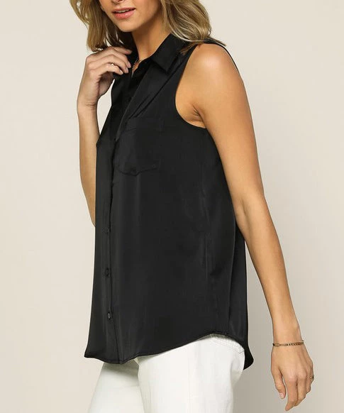 This satin sleeveless button down blouse is a warm weather must. Featuring a classic fit and a button down fit, this top can be worn for work or play.
