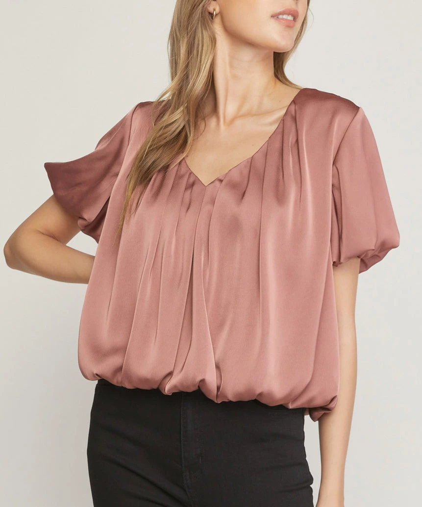 This gorgeous satin top features a v-neckline, bubble sleeves and a bubble hemline. Simply stunning, this top can easily transition from work to play. So elegant and chic!