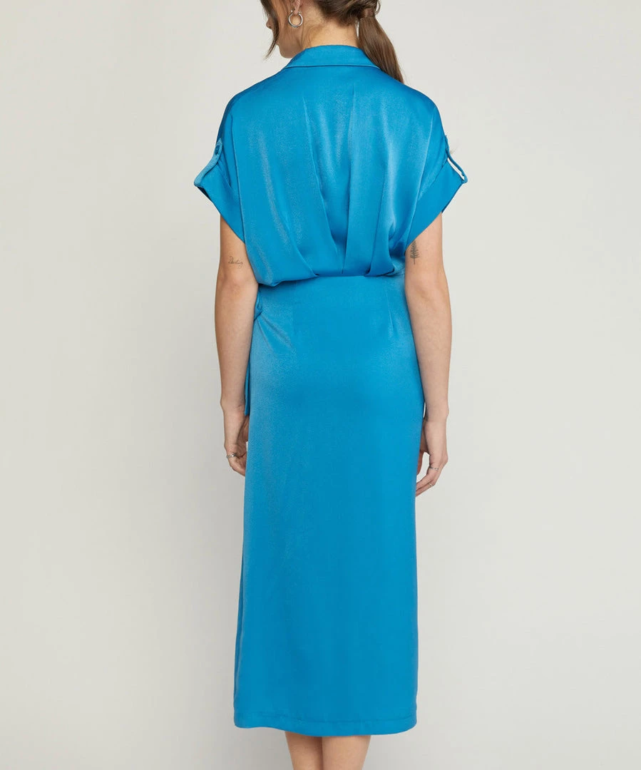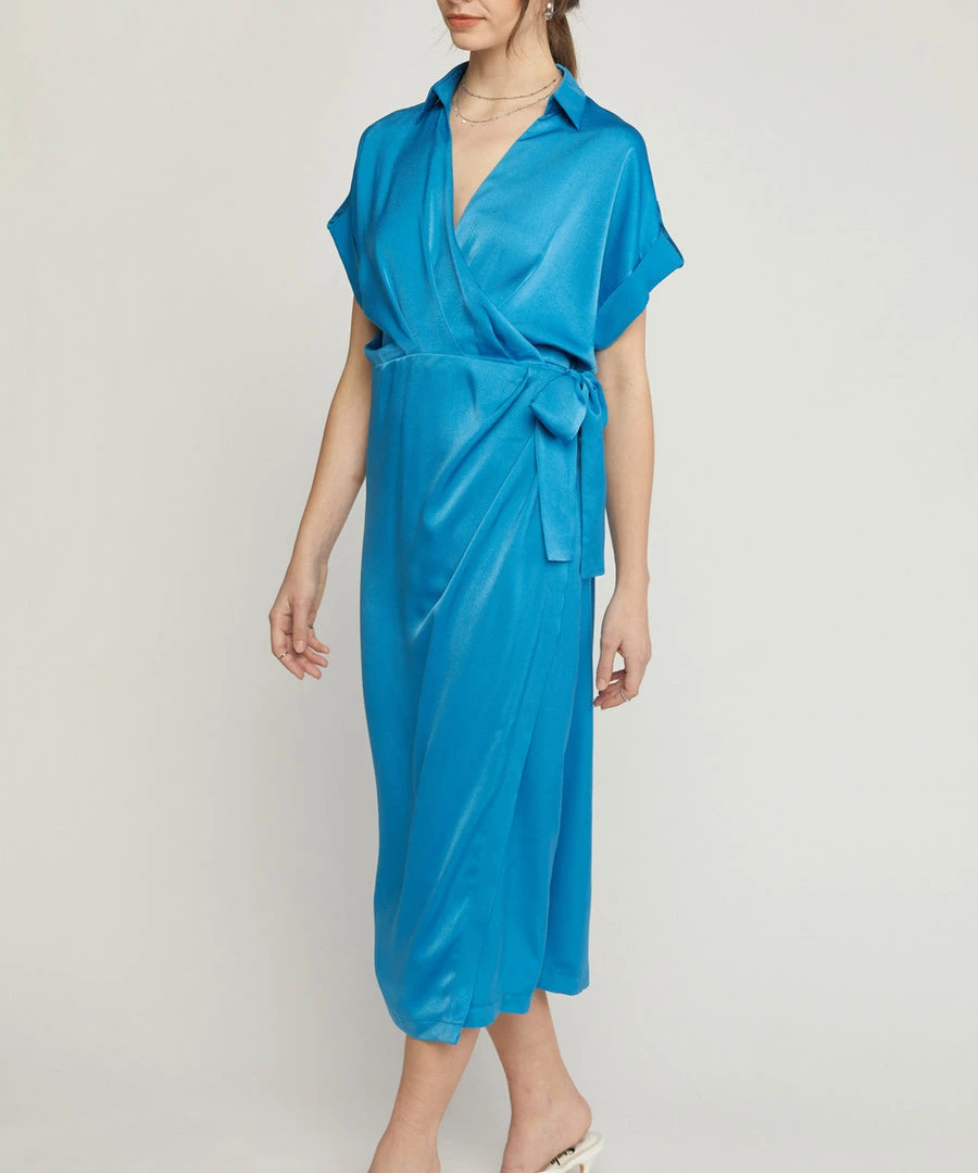 This satin short sleeve wrap dress features a collared neckline with self tie closure at the side. Permanent rolled sleeves with button closure complete the look.