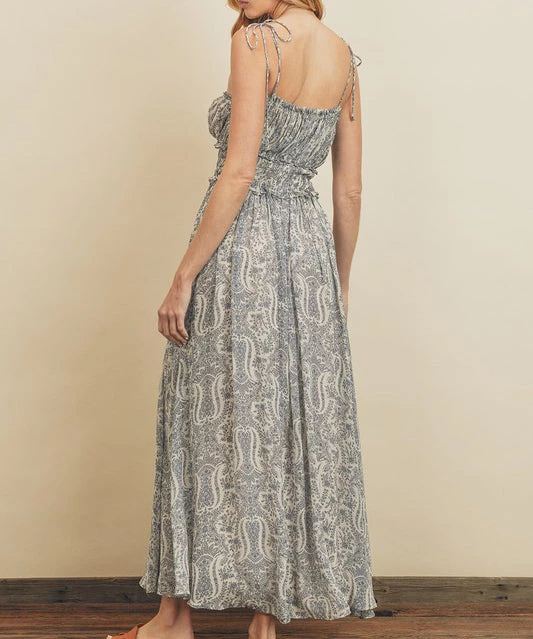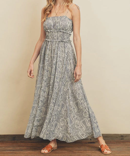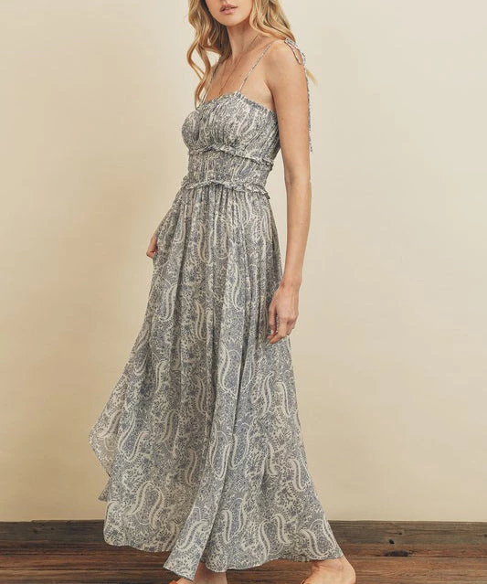 This gorgeous maxi dress features a paisley print, ruched chest, smocked waist, flared skirt and dainty ruffle trims. Complete with self tying shoulder straps, this dress is a stunner!