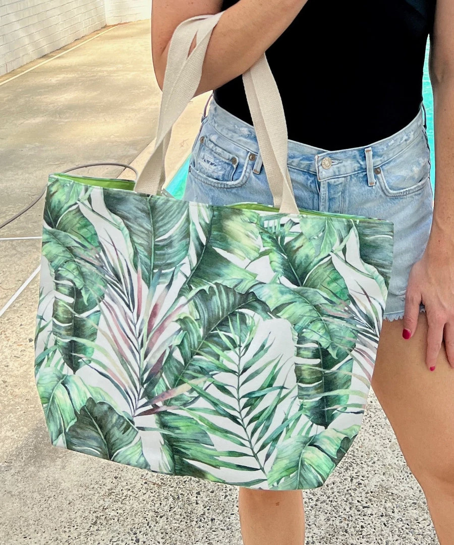 This is the go-to tote style for summer. It is super lightweight and has a palm leaves printed pattern with soft fabric handles. There is a top magnetic closure, and the inside is completely lined. It has a smooth polyester beach bag feel.