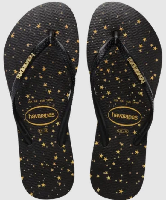 Bring the stars to the beach in the Slim Metallic Print flip flop. This twist on an iconic style features golden stars on the slim sole. Black slim straps are topped off with a metal Havaianas logo for a little extra shine.