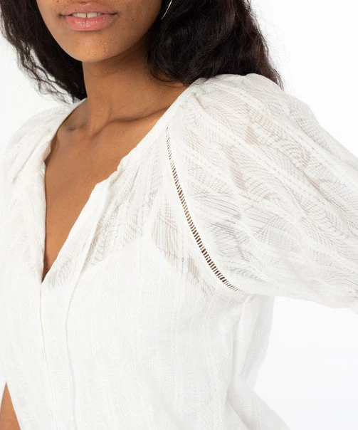 This sheer, boho blouse features a functional button front, short puff sleeves and a split neckline with a tassel tie front. A subtle leaf print with embroidery and lattice trim detail complete the look.