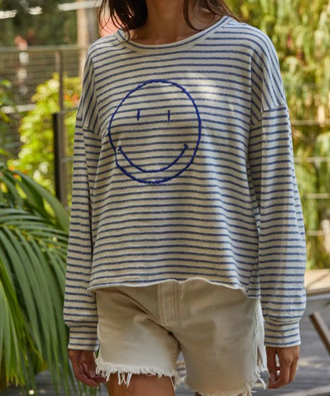 This soft and comfy knit pullover features a striped pattern accented with a smiley face. A fun take on the trend that is a must for casual days.