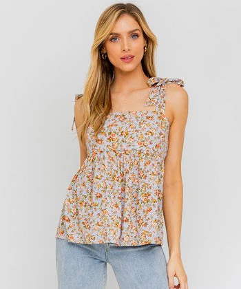 This darling floral print top features a ruffle bottom hem and self tie shoulder straps. A summer must to wear with everything from jeans to shorts to skirts.