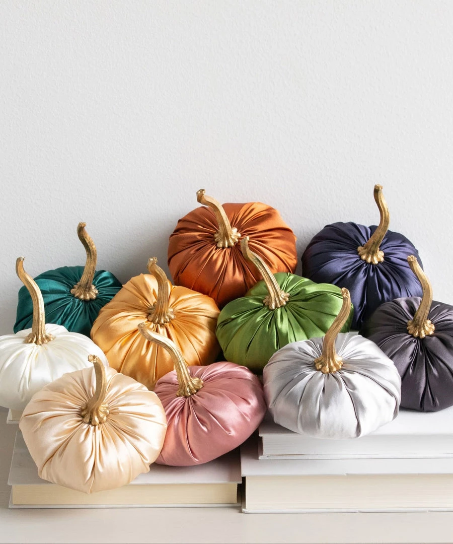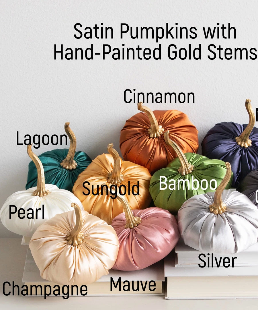 Our handmade small SATIN pumpkins will add sophistication to any home style. The hand-painted gold stem is resin and very durable. The soft satin fabric adds a luxurious pop of color to centerpieces, tablescapes and party decor. This small pumpkin measures approximately 5″ wide x 3″ tall, PLUS the 3.25″ tall stem. All are handmade in Wisconsin.