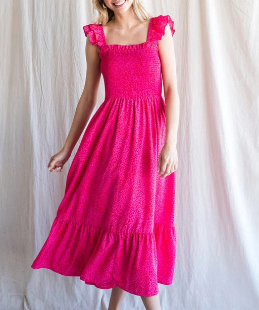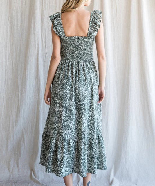 This darling print midi dress features a smocked bodice, ruffle shoulders and a peplum hemline. Flattering, comfortable and so cute, this dress is a summer must to pair with everything from sandals to sneakers to heels.