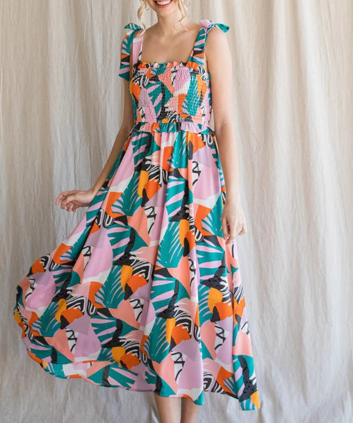 This gorgeous printed midi dress features a smocked bodice, shoulder tie straps and ruffle details. A summer must for day outings or vacation. So cute and comfy!