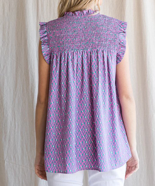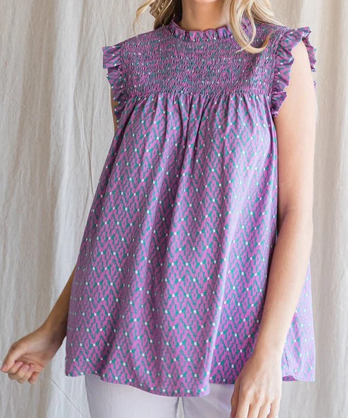 This darling top features a fun print with smocking detail at the top and ruffle cap sleeves. A must for work or play, this top can be worn with everything from jeans to skirts to shorts.