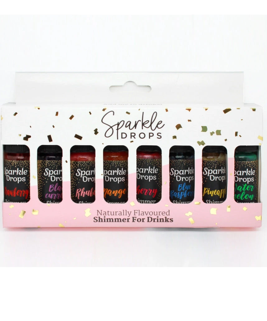 8 Pack gift set of Naturally Flavored Shimmer syrups in 10ml pipette Bottles. Great for Prosecco, Gin, Vodka, Cocktails, Mocktails and soft Drinks. Purple Blackcurrant, Red Strawberry, Golden Pineapple, Blue Raspberry, Orange Mango, Pink Cherry, Green Watermelon, 48-64 Servings. Put the drops in your drink for an instant transformation!