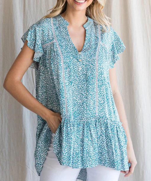 This darling top features a spotted print with caged trim details, a collarless button-up neckline and ruffled cap sleeves. A must to throw on with white jeans or shorts and wear all summer long.
