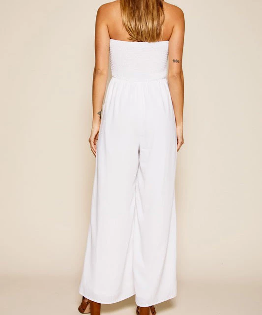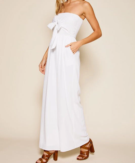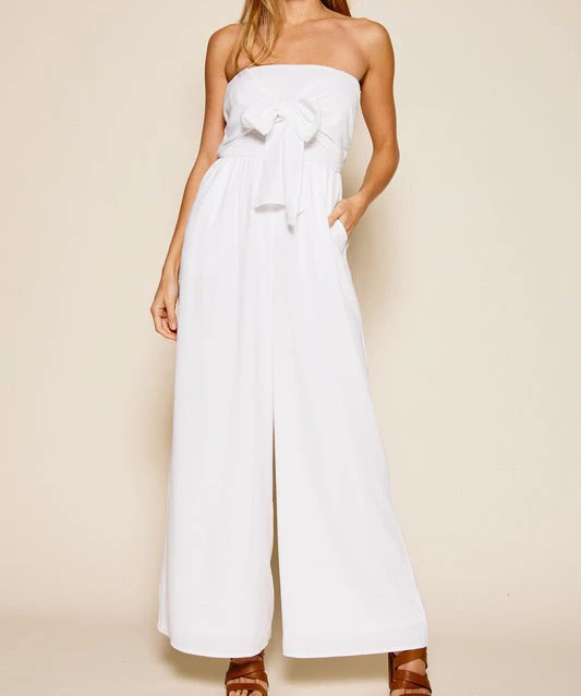 This gorgeous strapless jumpsuit features a tie in front and wide legs. Comfy and so chic, this outfit is a must to wear all summer long.