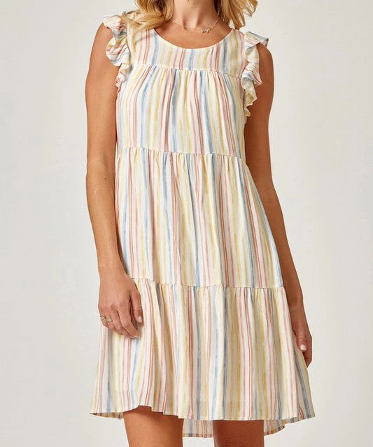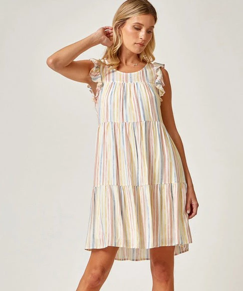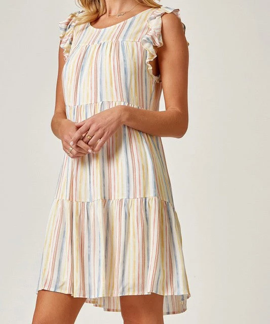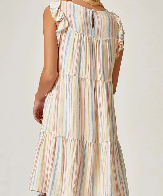 This darling dress features a multi color stripe pattern, flutter sleeves, and a relaxed fit. A summer must!