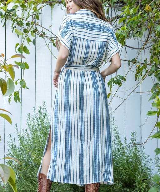 This striped dress features a flattering silhouette with a matching belt. A classic style that is comfy and chic, this dress is a must for work or play.