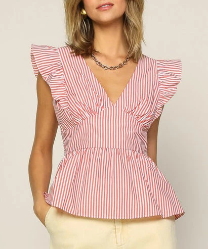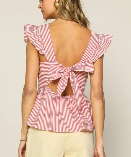 This short sleeve striped top features the cutest tie back detail and ruffle details. A must to pair with everything from shorts to jeans.