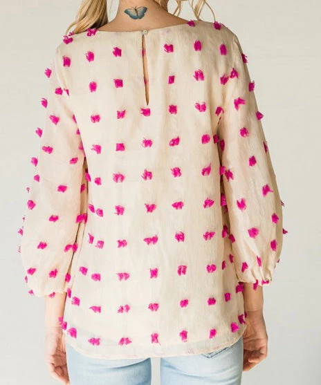 This fun blouse features a pink swiss dot pattern with three quarter bubble sleeves. A must for work or play, this whimsical top is so fun for summer.Â