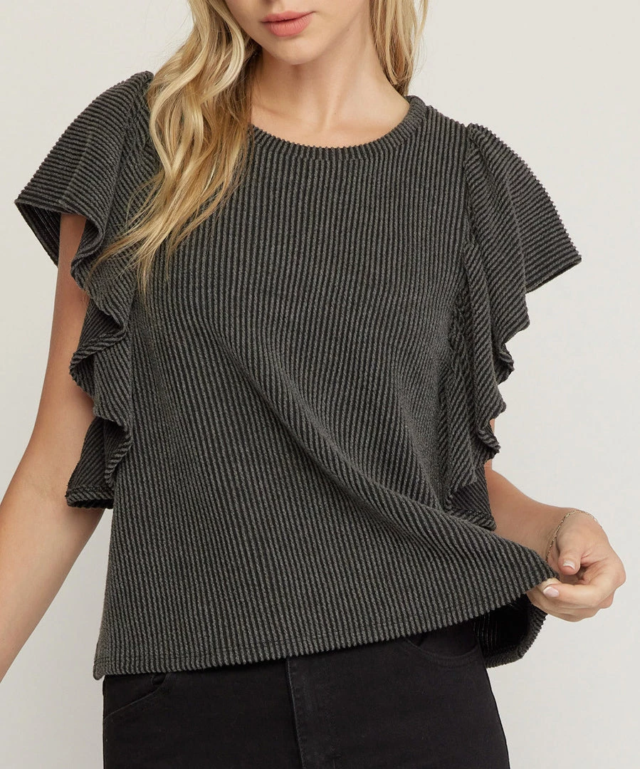 This textured ribbed top features short flutter sleeves. Soft, comfy and chic, this top gives you an elevated casual look.