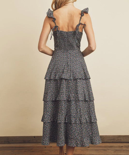 This gorgeous ditsy floral print dress features a tiered ruffle skirt, tie straps, and a zipper back closure. Complete with a smocked back panel with a hidden zipper closure, this tiered a-line silhouette is chic and comfortable.