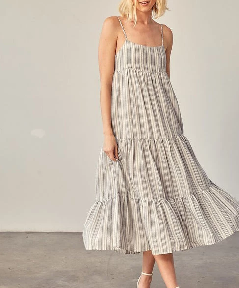 A classic stripe dress updated with a fun tie back detail on the back. Easy to take from day to night, this dress is so cute!