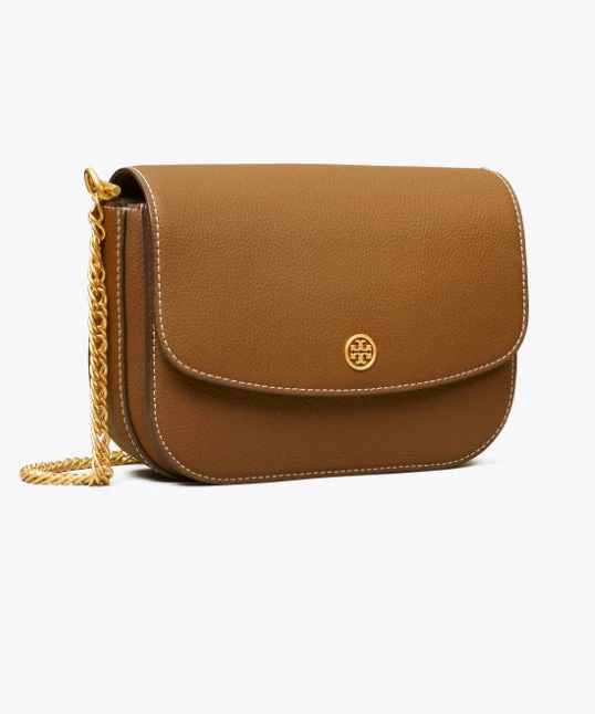 A collection named for Tory’s parents, Buddy and Reva Robinson. The Robinson Pebbled Shoulder Bag is made of the highest-quality, scratch-resistant leather. Designed with rounded edges, it has an adjustable chain strap — wear it doubled or long and crossbody.