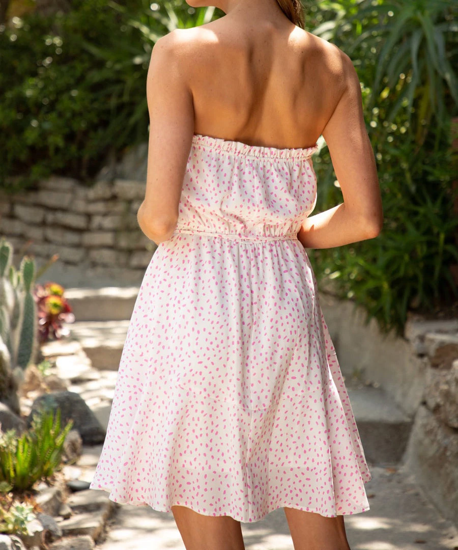 Tube tops are making a comeback! We are loving this style! It features an elastic waist with tassel, and an all over pink and white abstract print. Throw on your sneakers or sandals and you’re good to go!
