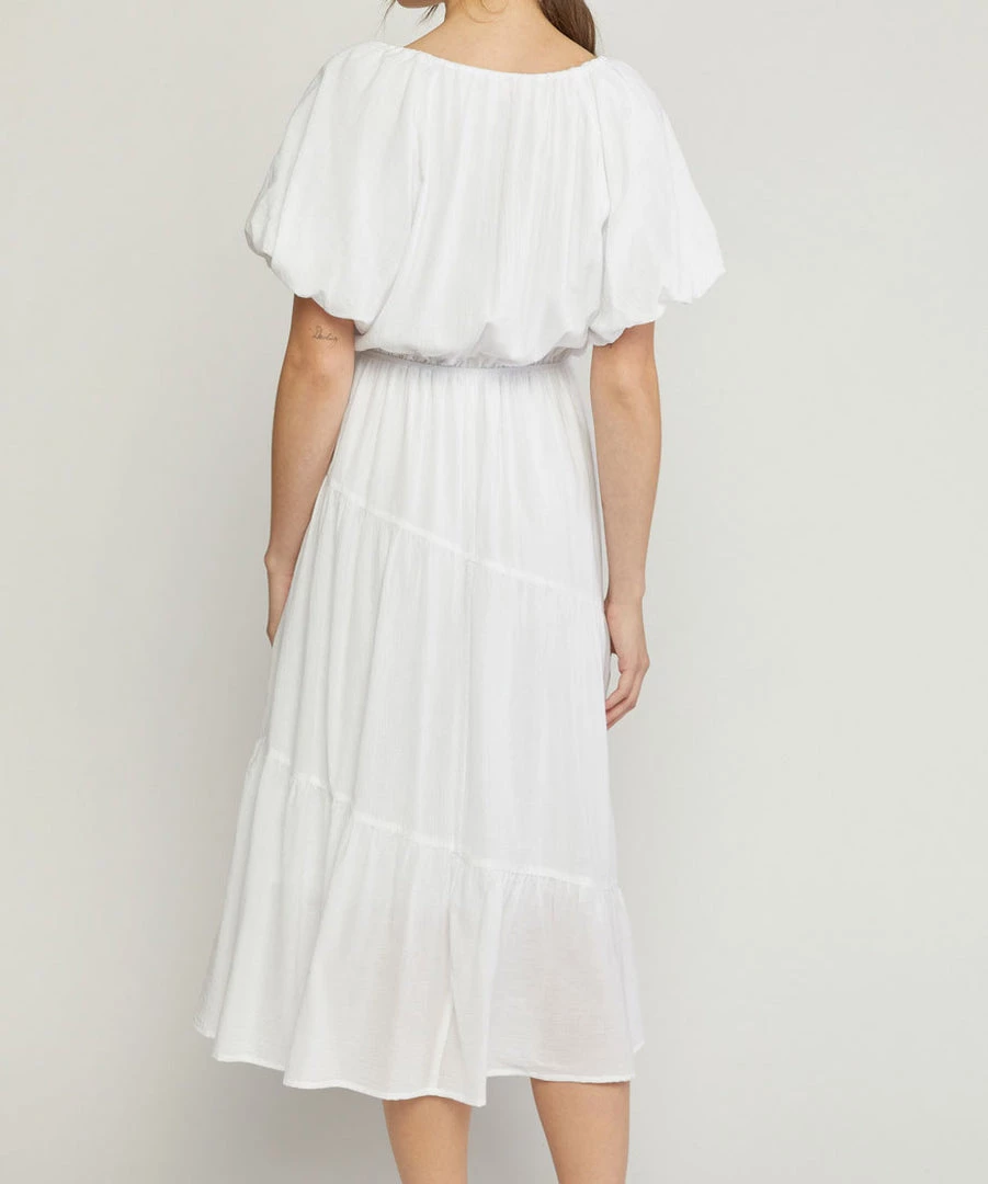 This solid v-neck dress features a midi length, bubble sleeves and self tie closure at the front. On-trend and so cute for day or night!