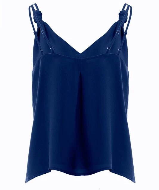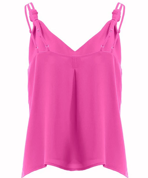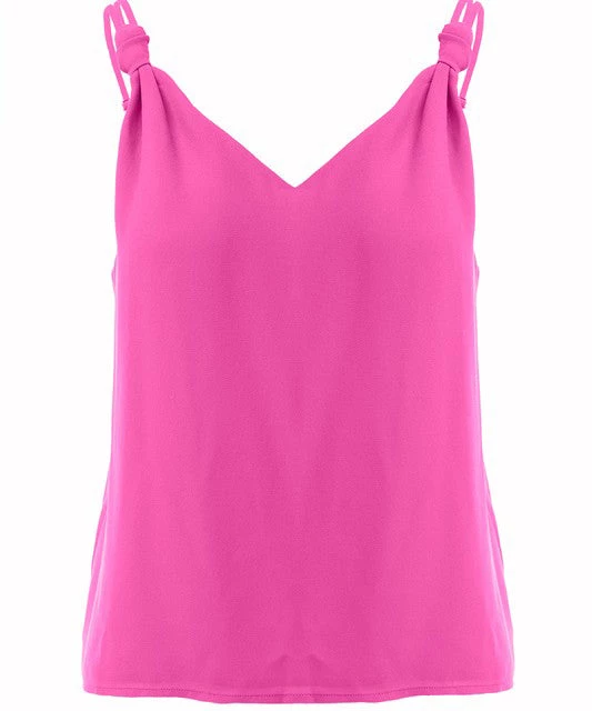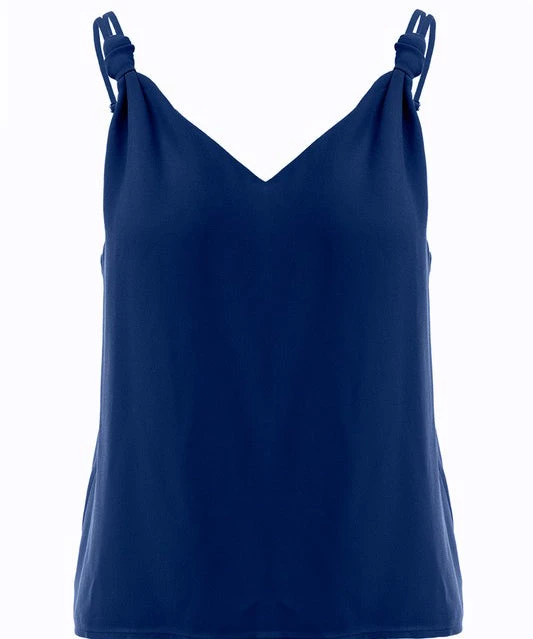 This v-neck tank top features a self knot shoulder detail. A great basic to wear alone or layered, this top can be worn for work or play.