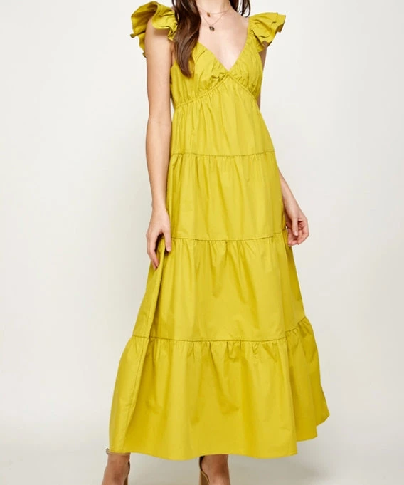 This tiered maxi dress is a summer dream! Featuring a v-neckline and ruffle sleeves, this dress can be worn casually or dressed up for a special event.