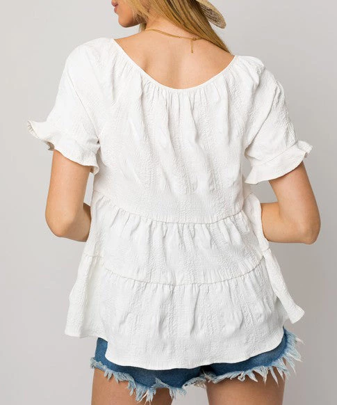 This short sleeve top features a shirring detailed neck, v-neckline and a slit tie top that can be worn open or tied. A wardrobe staple that can be worn dressed up or down.