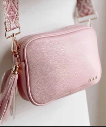 This Faux-leather crossbody bag is so soft and dreamy. Comes with a trendy and fun canvas strap and shiny gold classic hardware! Zippered Top and linen beige interior with a zippered stash pocket on the inside.