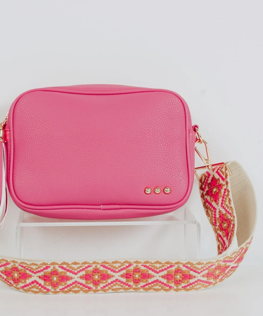 This Faux-leather crossbody bag is so soft and dreamy. Comes with a trendy and fun canvas strap and shiny gold classic hardware! Zippered Top and linen beige interior with a zippered stash pocket on the inside.