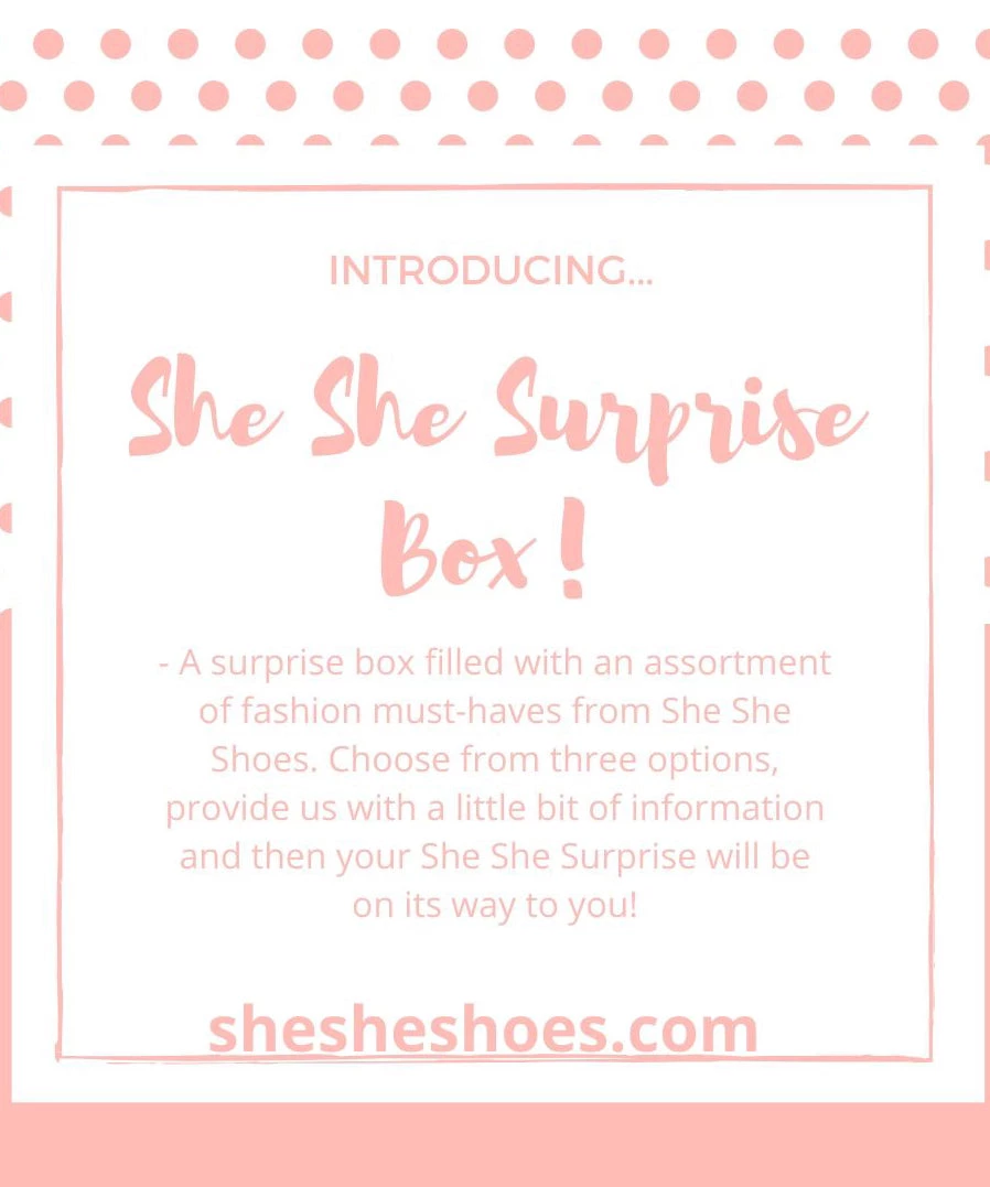 She She Shoes is bringing you a fun new way to shop….we do it for you! This box includes two tops that can be worn for work or play. Let us know a bit of information and we’ll do the rest. Items can be mailed back for return.