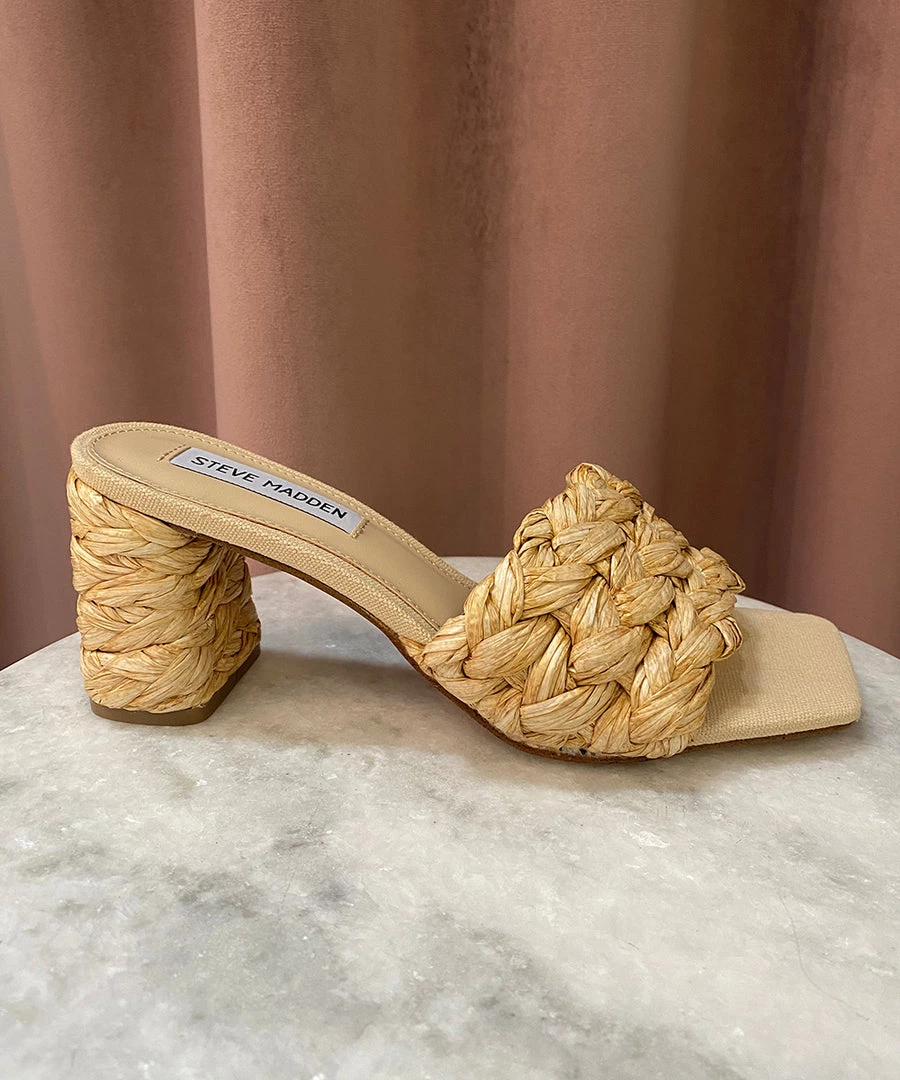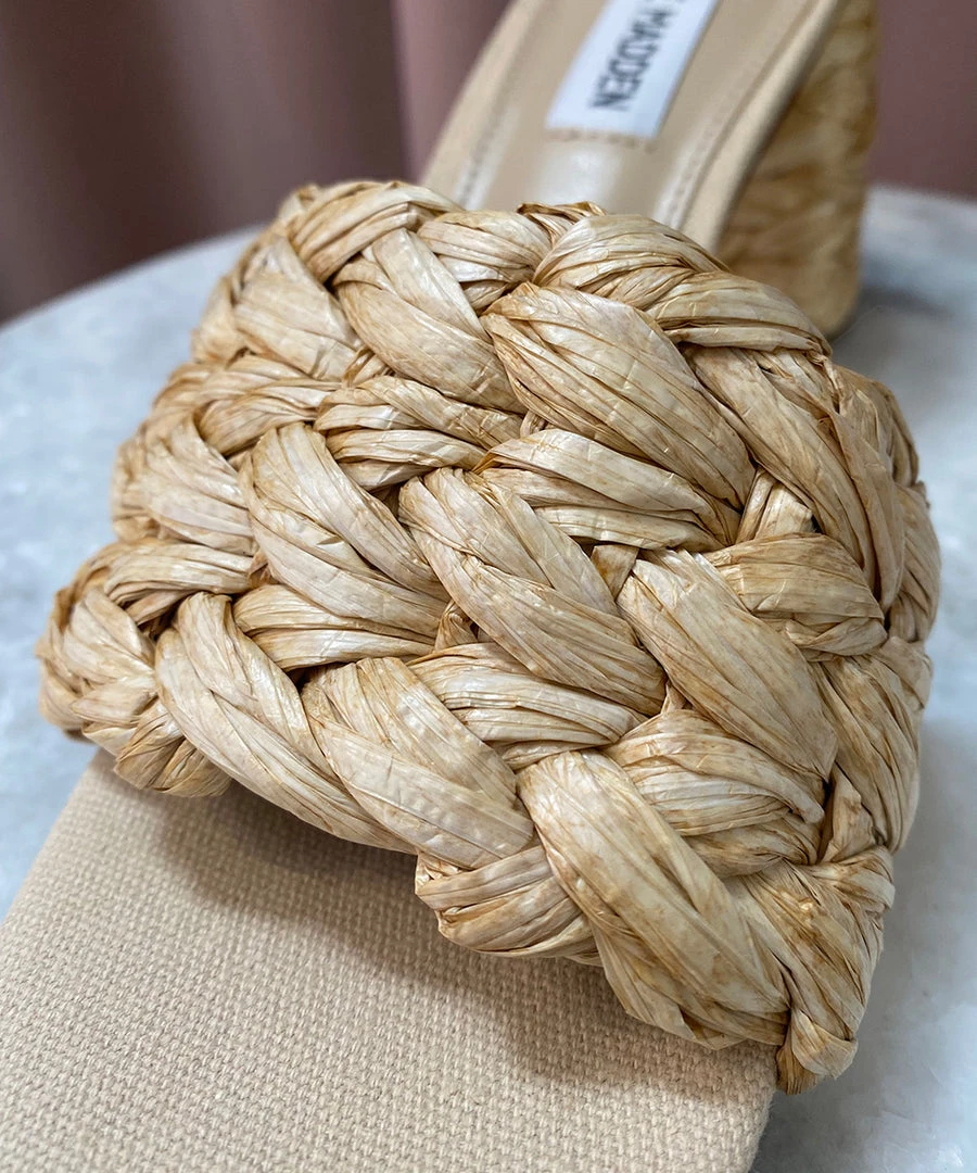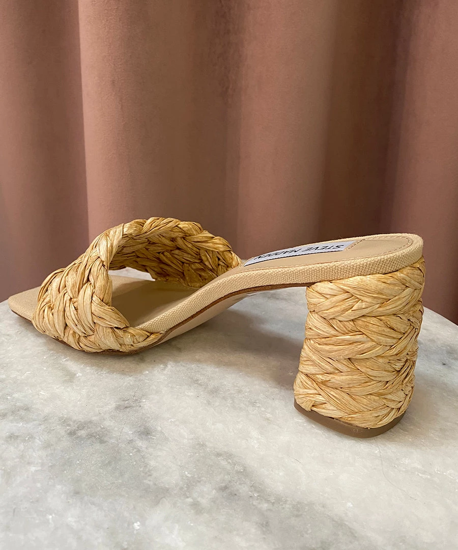 - Raffia upper and wrapped heel